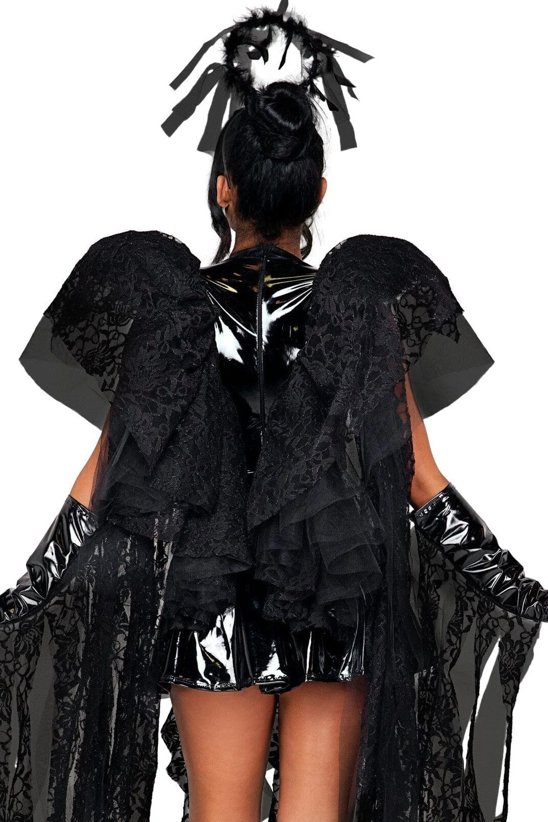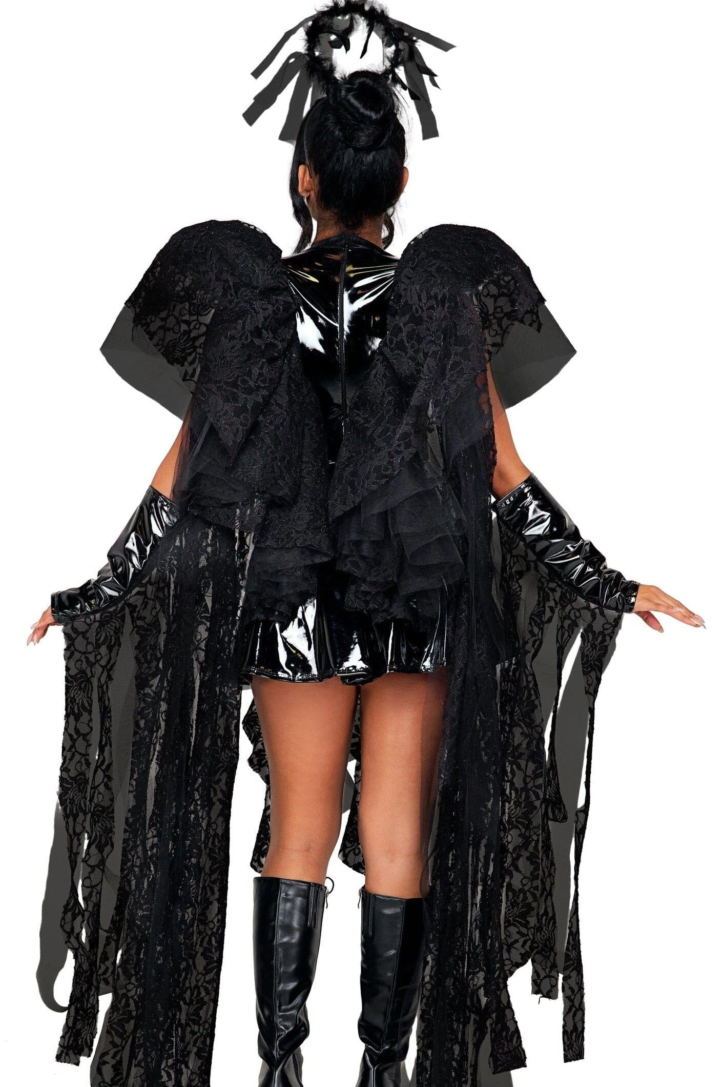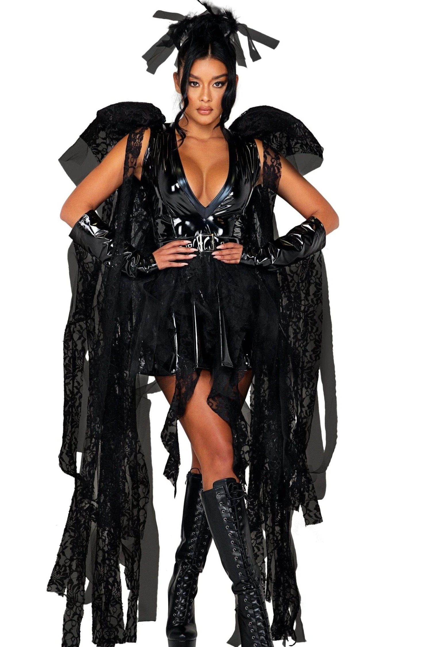 Includes: Vinyl Dress with distressed Lace Detail and Built-On Wings, Gloves, Belt, and Headpiece