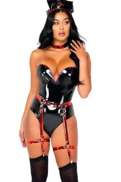 Includes: Vinyl Bodysuit, Choker, Garter Belt and Headpiece