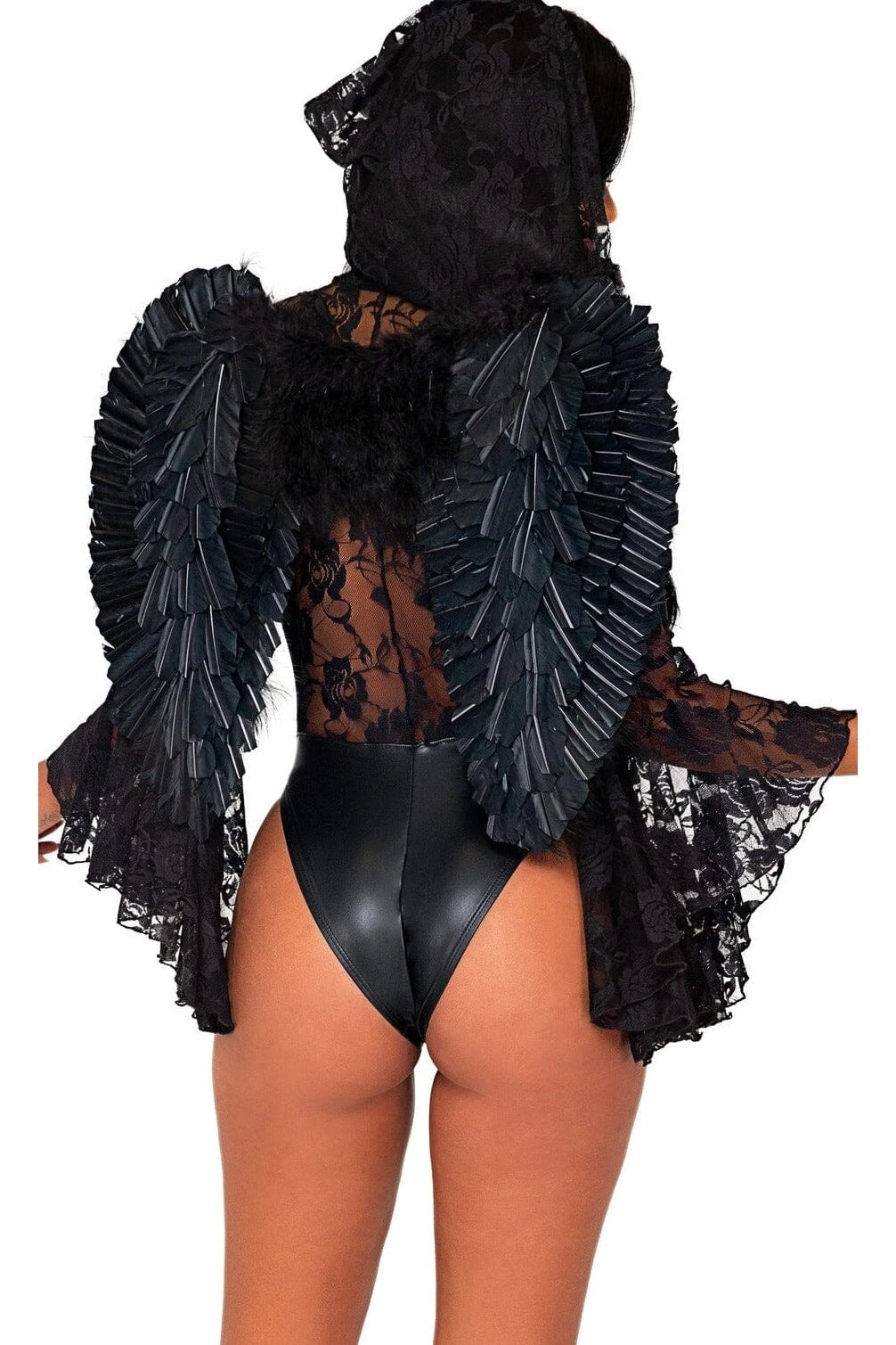 Roma Costumes 1pc Dark Angels Lust lace body suit with flowing long sleeves to add that extra edginess. This bodysuit has a deep V neckline and bottom half is made with a patent material.