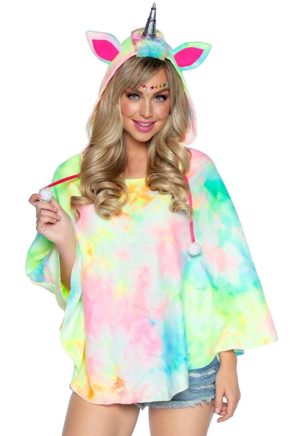 Leg Avenue Unicorn Poncho, features tie dye poncho with fur mane and tail and unicorn horn hood.