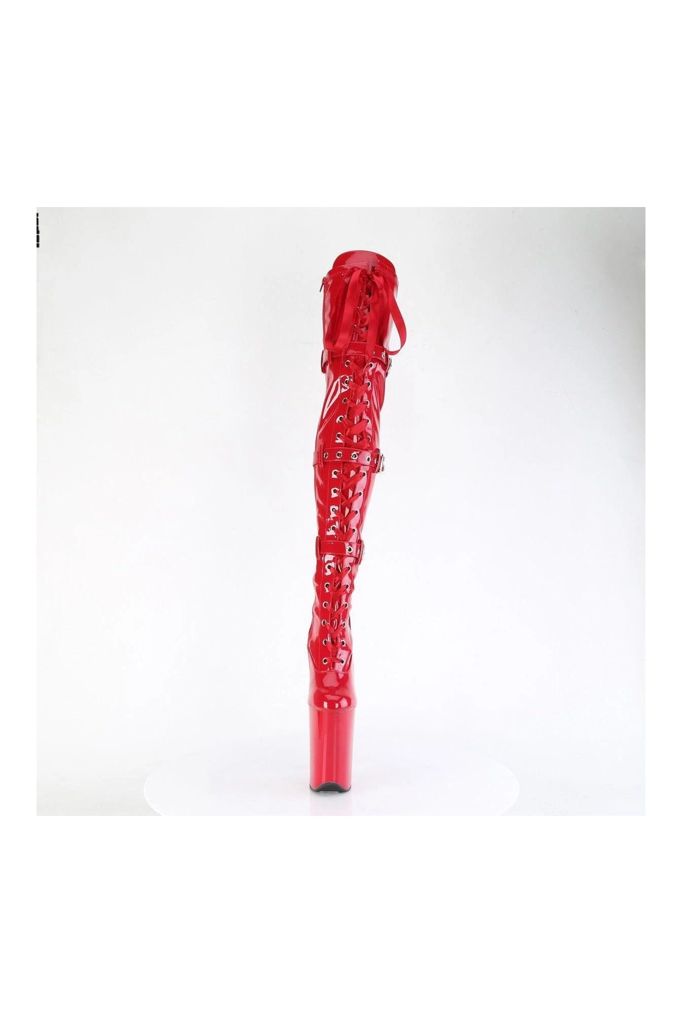 9″ Heel, 5 1/4″ Platform Buckled Lace Up Thigh Boot, Side Zipper