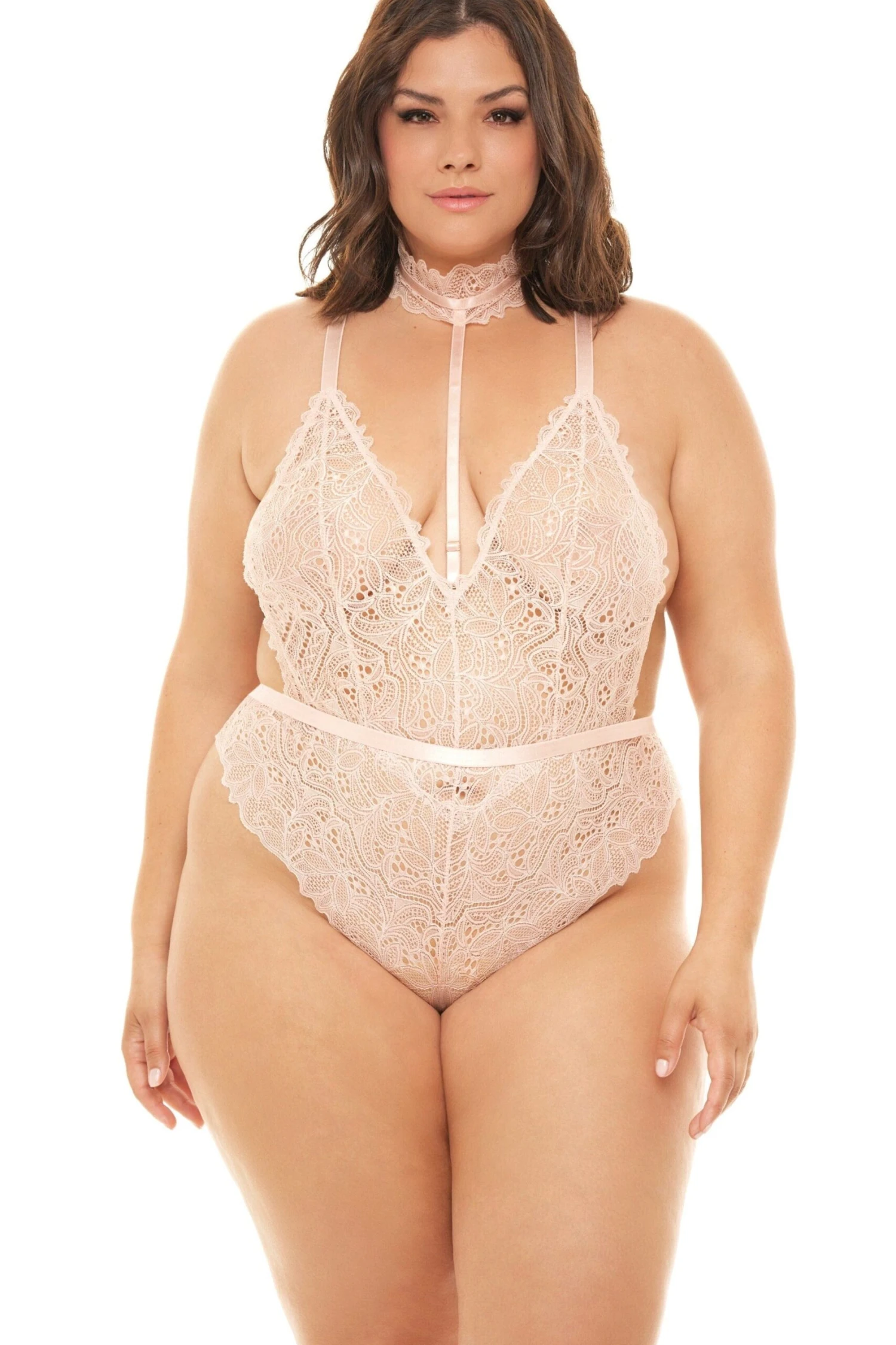 Lace Deep Plunge Teddy With Open Back And Harness Collar Detailing