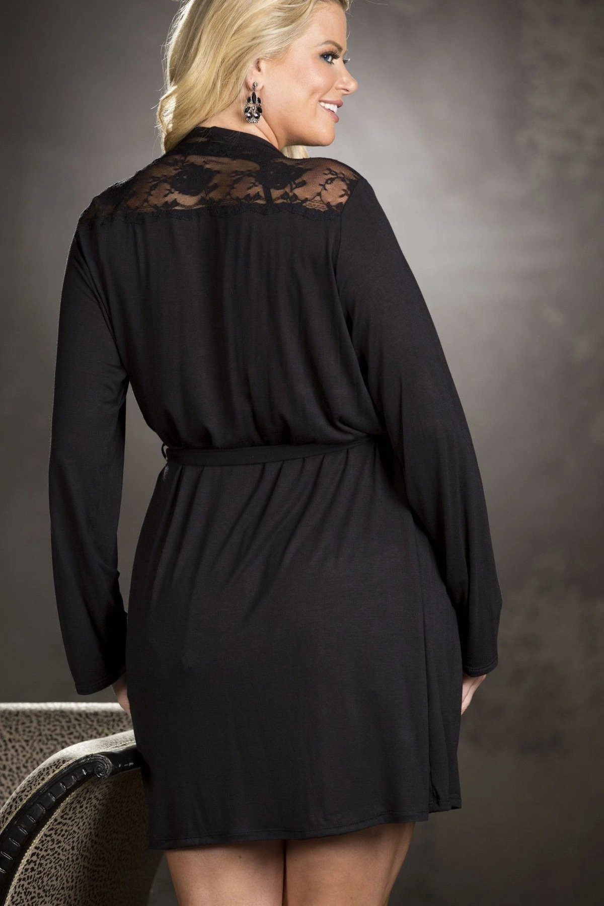 Super Soft Knit And Stretch Lace Robe With Sexy Lace Panels At Shoulder And Has Side Pockets And Matching Belt Closure.